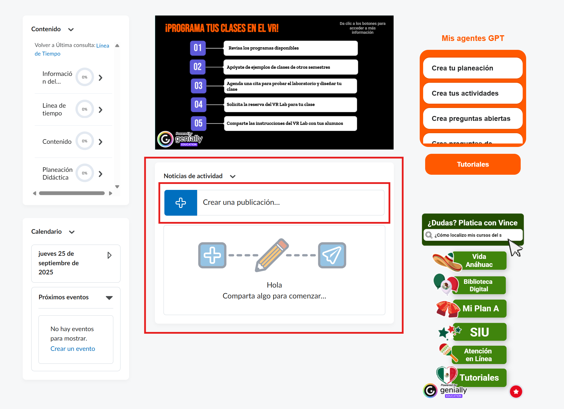 • Importante: tener un orden con los mensajes que se vayan publicando y que se eliminen los que ya no se necesiten, ya que estos se acumulan y la herramienta de calendario que se encuentra debajo de los mensajes puede llegar a ser ignorada por los alumnos.