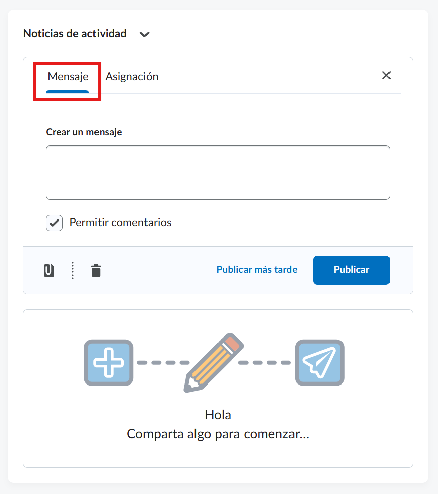 • Paso 3. Redactamos el mensaje que queremos publicar. Tenemos la opción de poder activar o desactivar permitir comentarios, para que los alumnos puedan responder a nuestra publicación.