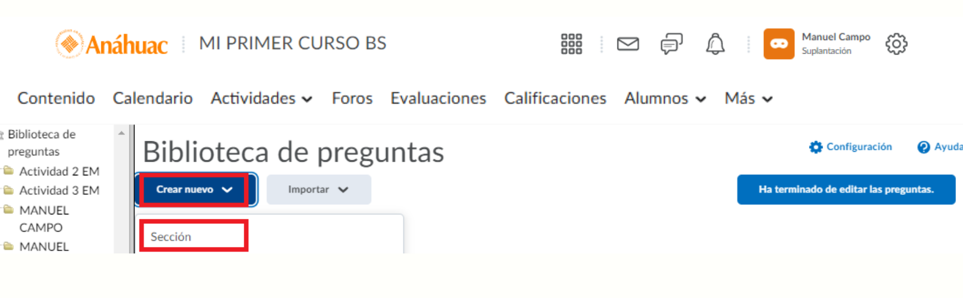 Sugerimos que las secciones a crear se titulen con base en el tipo tipo de Preguntas (elección múltiple) y con la sesión en donde estará presente (Sesión 1). (Ejemplo: Sesión 1. Elección múltiple)